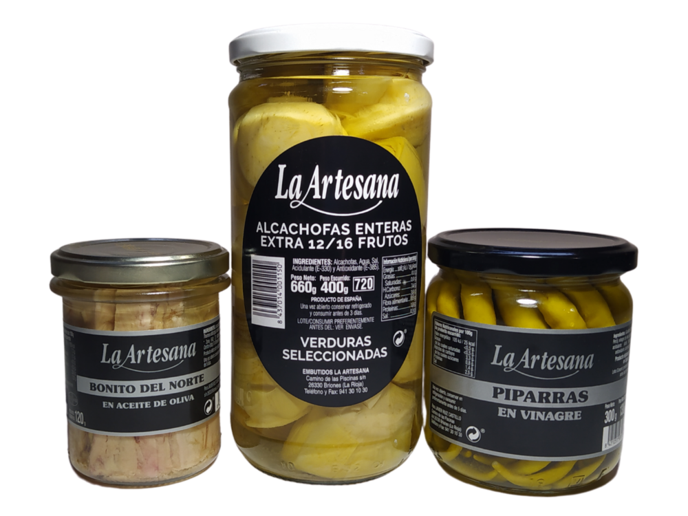 Embutidos La Artesana” es otra empresa de nuestro pueblo cuya especialidad, además del embutido de caza, son las conservas. Se nos ha planteado un reto complicado a la hora de elegir las tres variedades que formarán parte del pack pero buscando que tengáis una selección de 10, nos hemos decantado por unas alcachofas enteras -calidad extra-, el bonito del norte en aceite de oliva -espectacular- y unas piparras en vinagre, el complemento perfecto para un buen plato de legumbres.